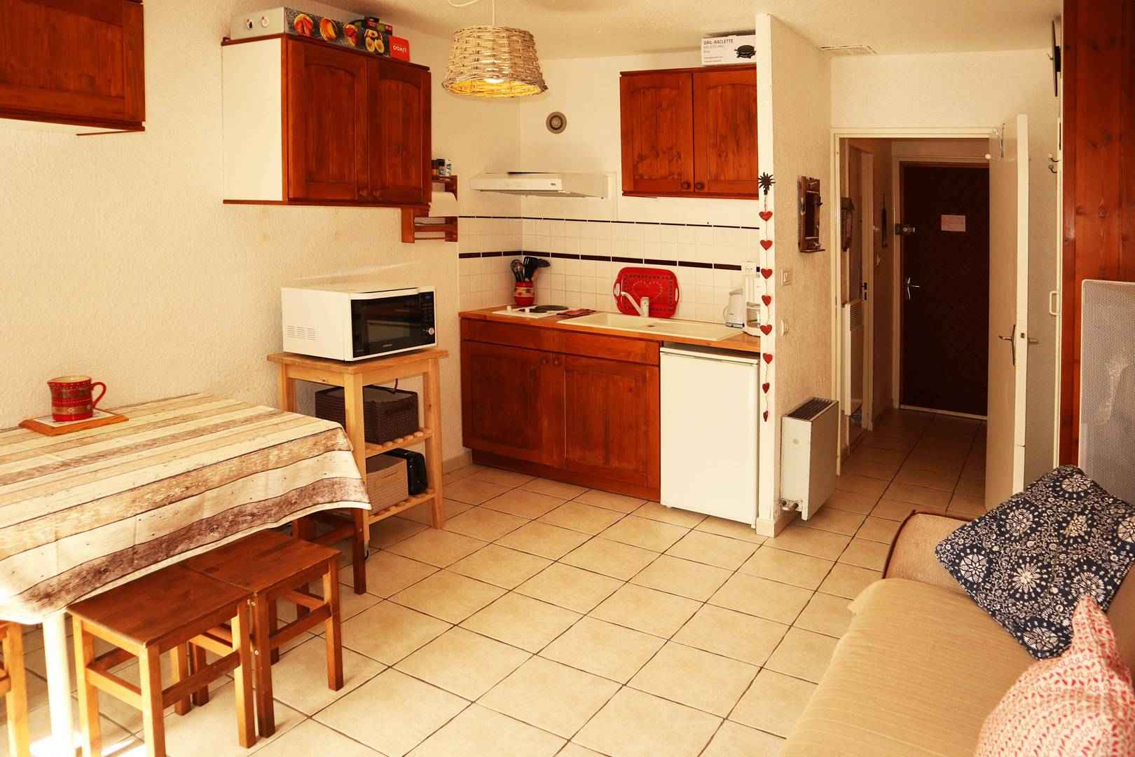Au 2ème étage, joli studio de bon confort équipé pour 4 personnes idéalement situé en plein cœur de la station des orres 1650, vue sur les pistes et à proximité de tous commerces comprenant une entrée avec 2 lits superposés 1 place, un séjour avec 1 banquette convertible 2 places en 160, un coin cuisine ouvert sur le séjour, une salle