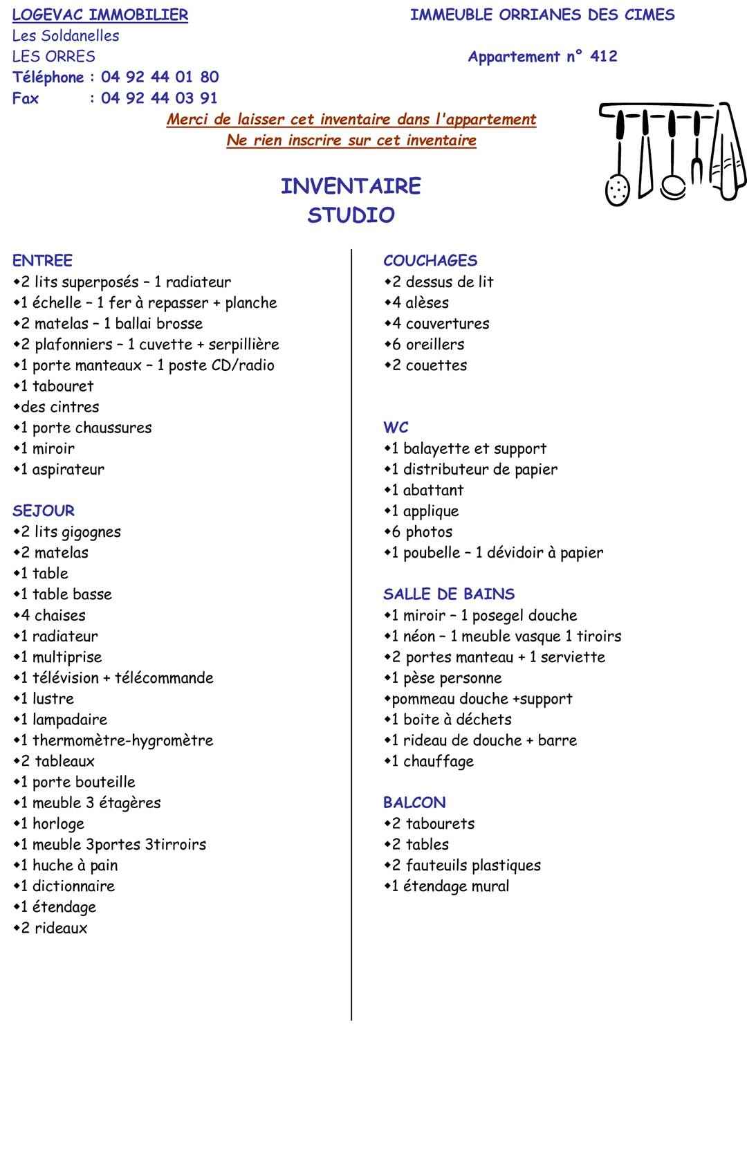 • Equipements : Micro onde, Box à Skis, Chauffage Electrique, Parquet, Télévision