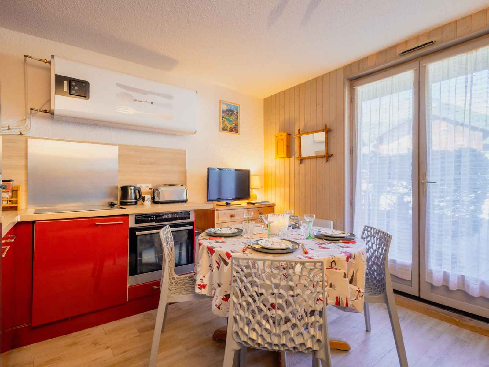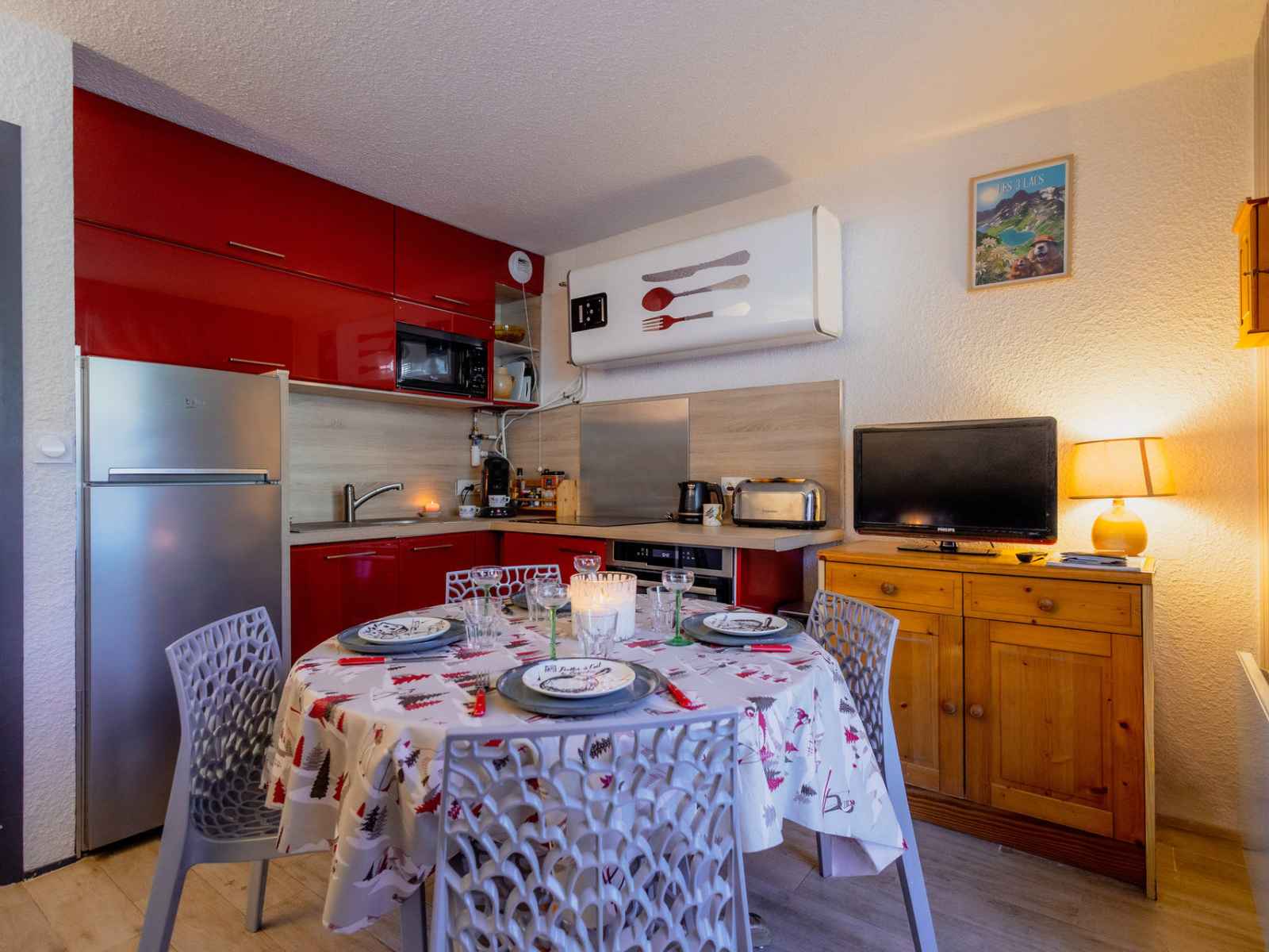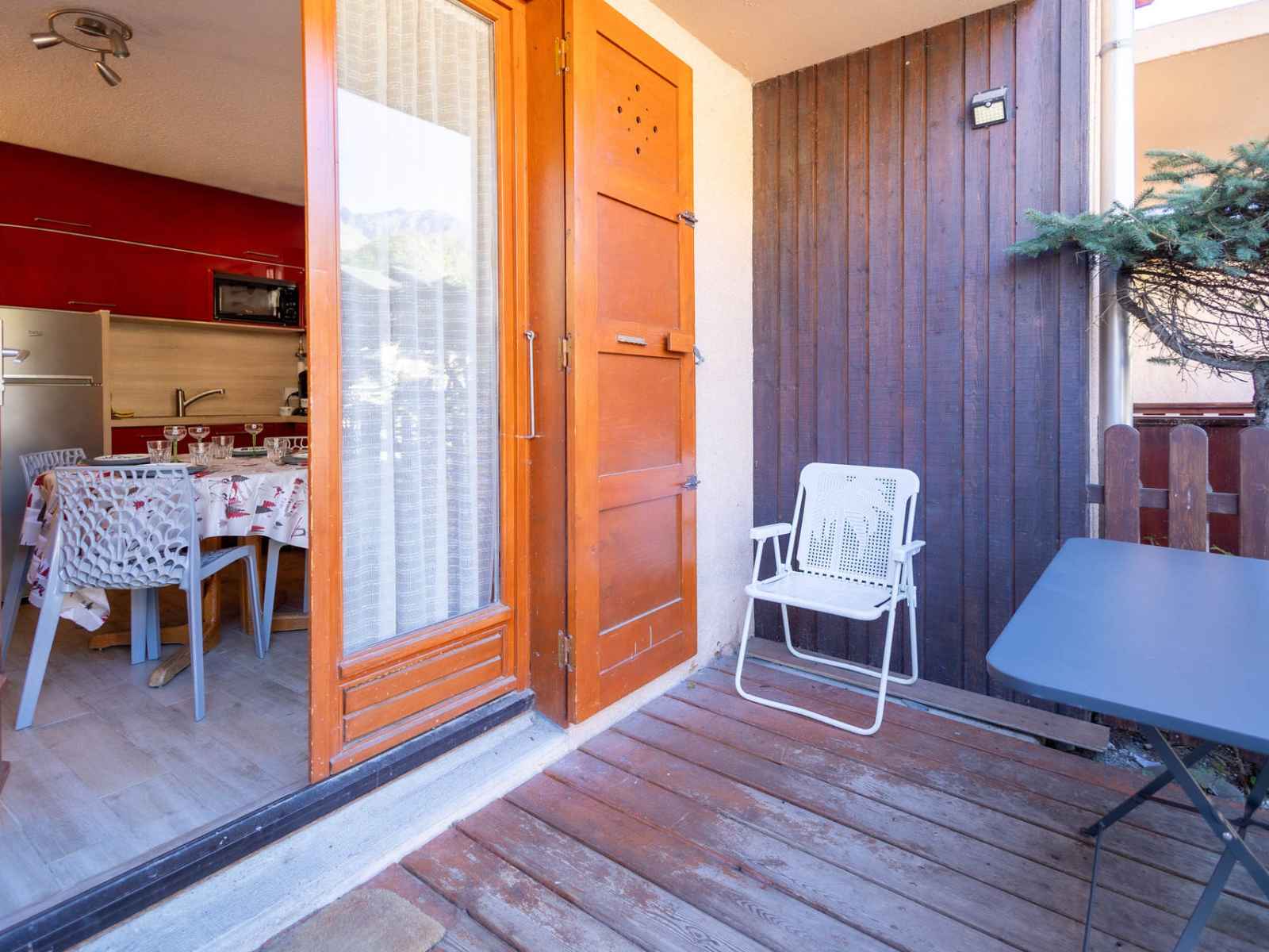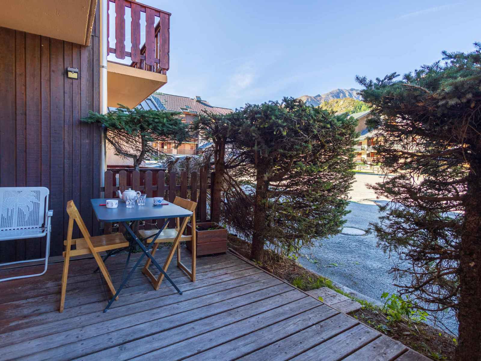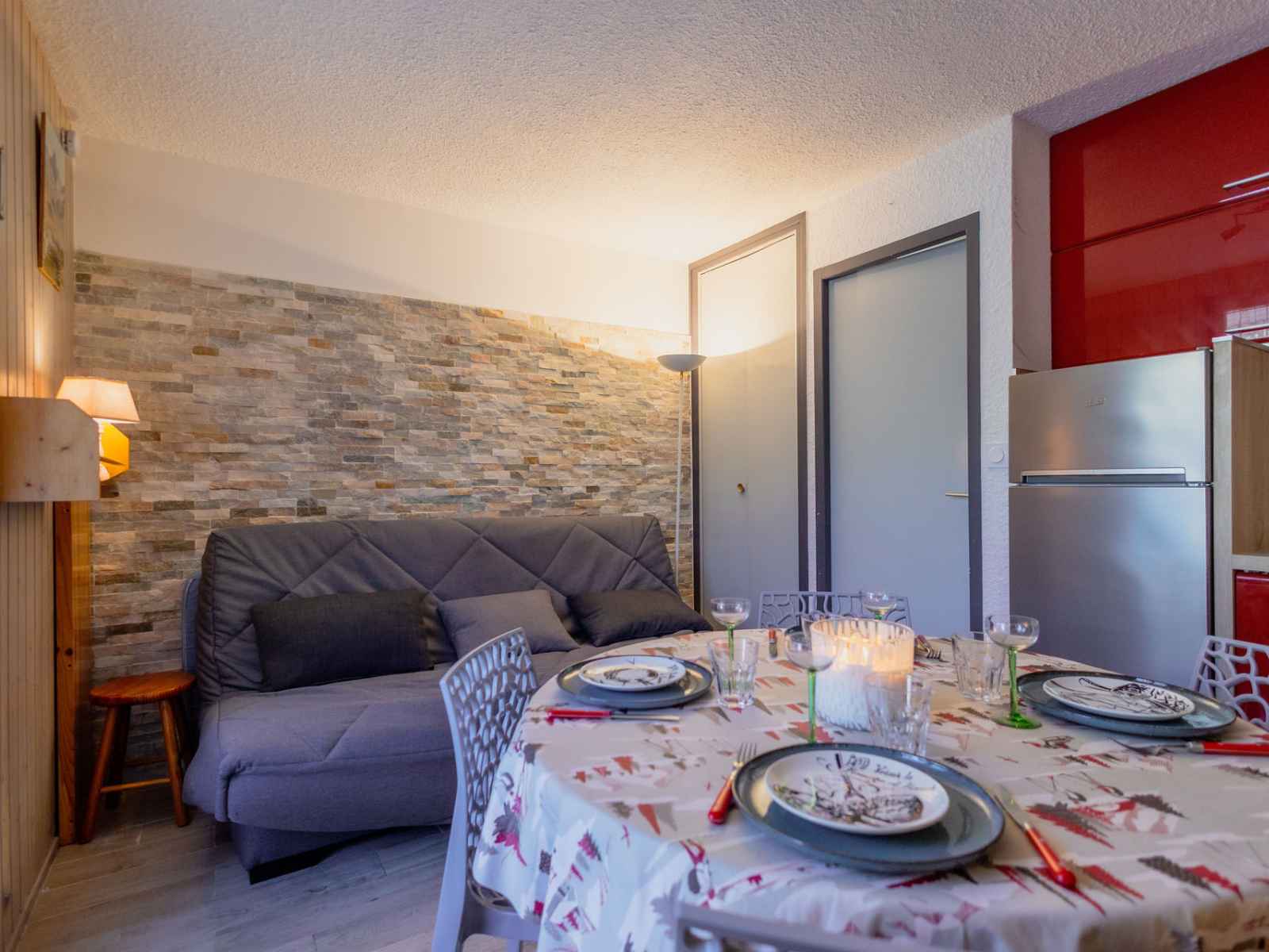Coin Salon : télévision Salle d'eau : lavabo, douche, sèche-cheveux. WC séparés. SERVICES/OBSERVATIONS : Animaux refusés. Linge de lit et de toilette non fournis. Casier à skis. HIVER : Ménage final inclus. ETE : Ménage final non inclus. Terrasse (8m²/ Sud-Ouest) avec salon de jardin. Parking collectif non privatif. Double accès au studio par la porte principale et par la terrasse (porte-fenêtre). Studio classé 3 personnes 3* ATTENTION : Caution par paiement dématérialisé avant votre arrivée.