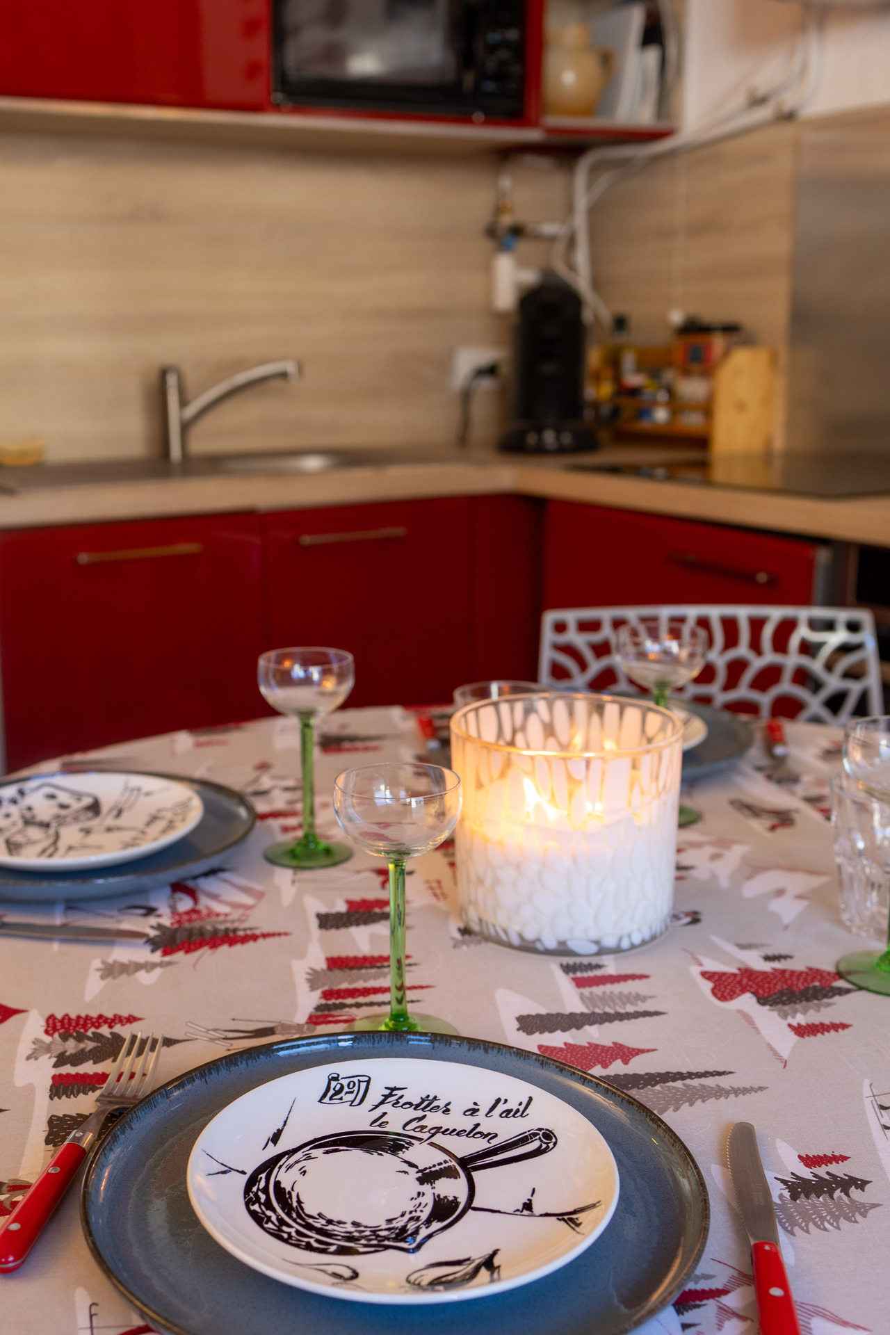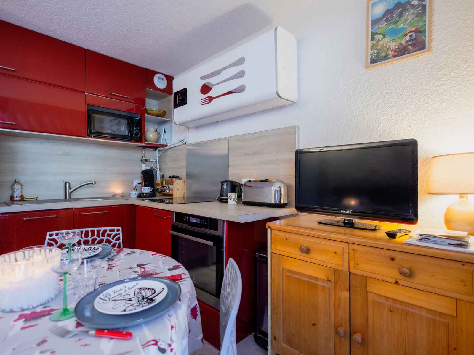 - coin cuisine : four, micro-ondes, plaque induction (5 foyers), lave-vaisselle, réfrigérateur/congélateur, lave-linge séchant